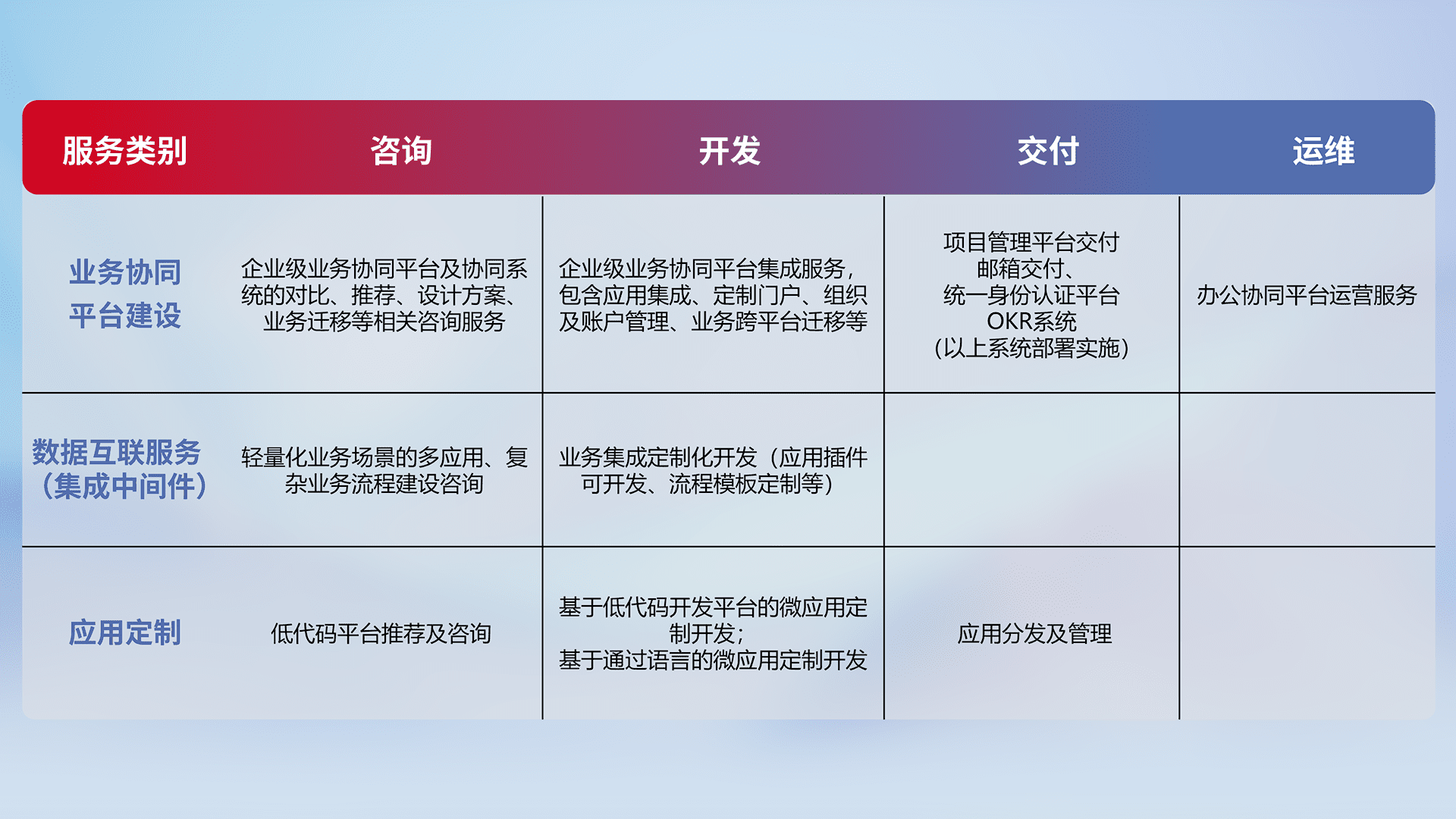 针对钉钉、、企微、、、IDaas等平台级产品提供产品的规划、、、、方案、、、、交付、、、、定制化开发等服务,,,,实现如统一协同办公、、智能客户服务、、、、混合会议管理、、、、智能数据查询、、等业务场景,,,,实现数字化转型。。