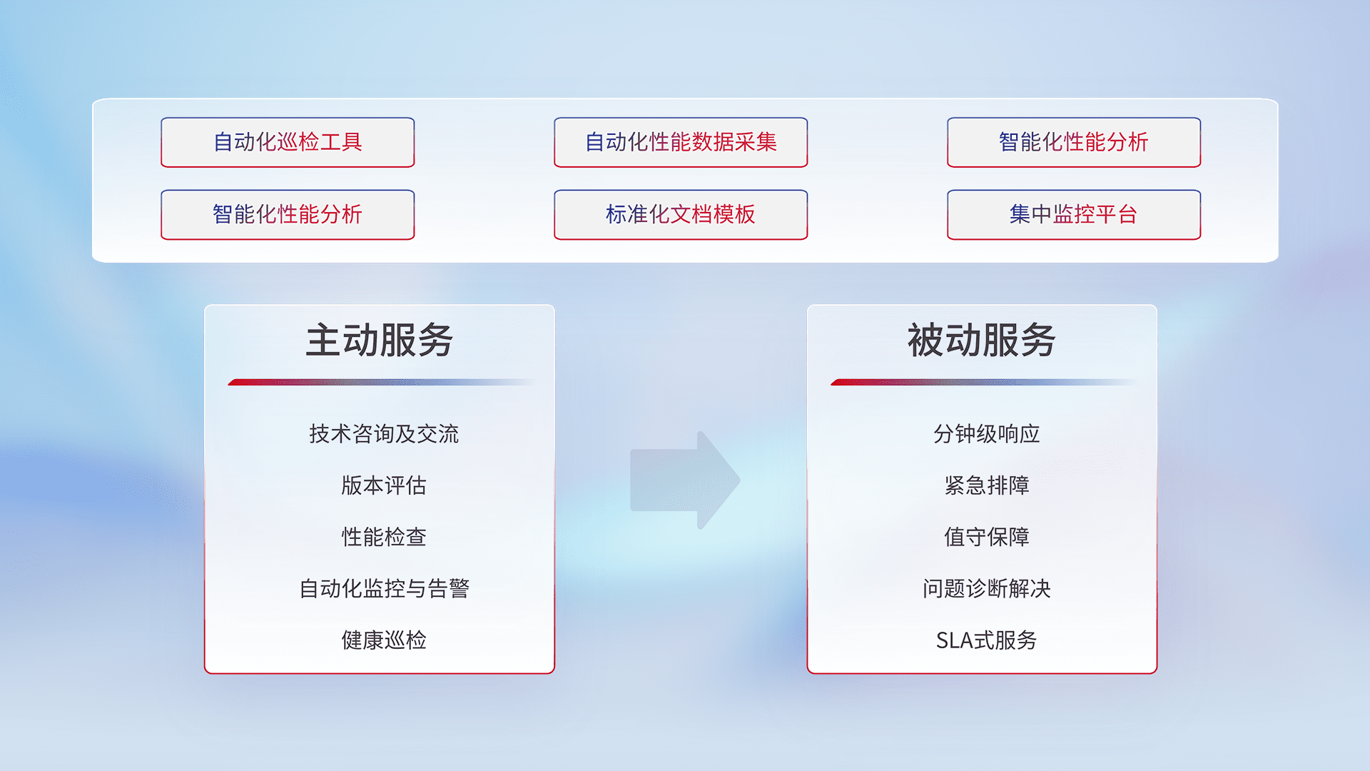 智能化工具和标准化文档,,,保障服务质量,,,提供主动服务(包含技术咨询、、、、版本评估、、性能检查、、、、自动化监控与告警、、、、健康巡检)和被动服务包含(分钟级响应、、、、紧急排障、、、值守保障、、、问题诊断解决、、、、SLA服务)。。。